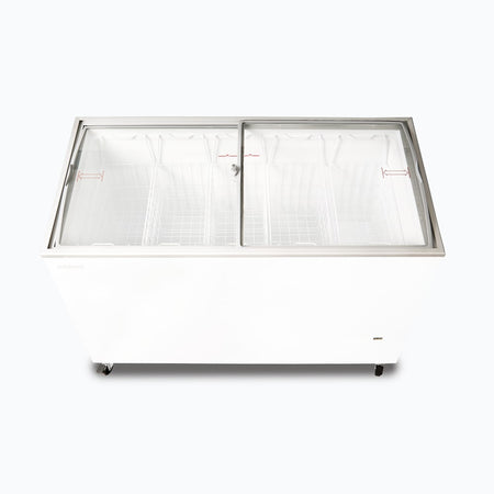 Our display chest freezer is a perfect deep freeze retail display solution. The angled top curved glass lid creates an attractive showcase for ice cream and frozen foods. With an 7-star energy rating, it ensures lower runnings costs. The sliding glass lids open left and right, allowing for effortless access to the products, while the included baskets keep items neatly arranged.