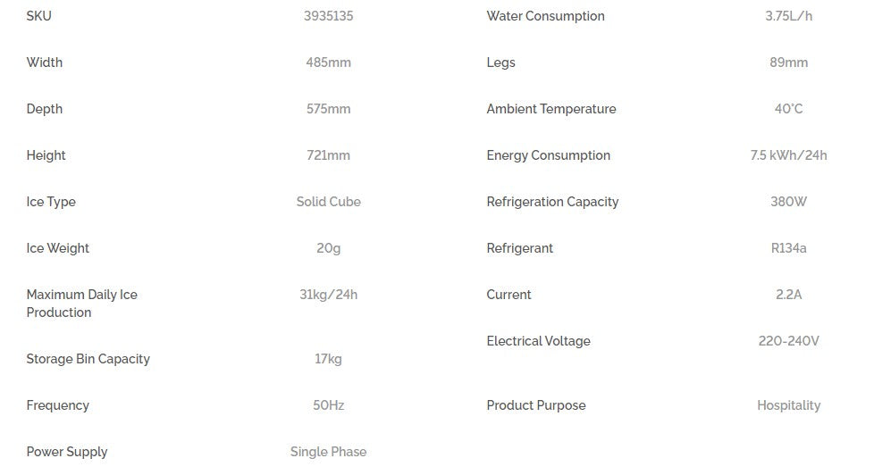 This all-in-one unit combines 31kg daily ice production capabilities with 17kg storage, offering ultimate convenience and saving valuable space. Enjoy premium quality solid cube ice, large and crystal clear, perfect for beverage-focused applications. Its space-saving design makes it ideal for under bench installation, while the hygienic Agion®-treated materials maintain a clean environment. With durable stainless steel construction, it’s built to last and easy to maintain.