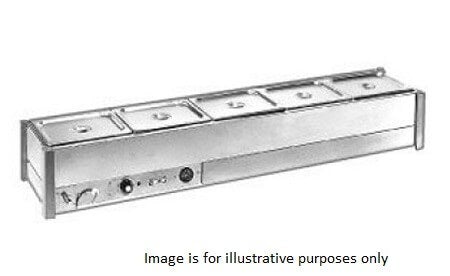 Designed to hold food at serving temperature, stainless steel construction, removable cross bars, safety lock ball valve drain, wet or dry operation, Dura-life stainless steel elements, energy regulator control, thermometer display, max pan depth 100mm, trolleys available. Comes with 6 x 1/2 size 100mm deep pans.