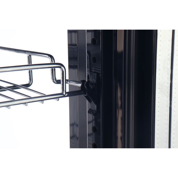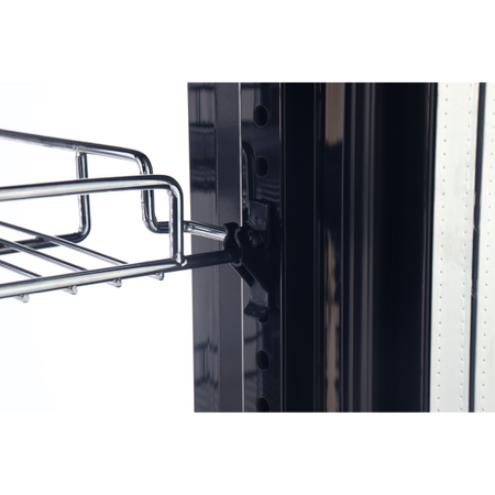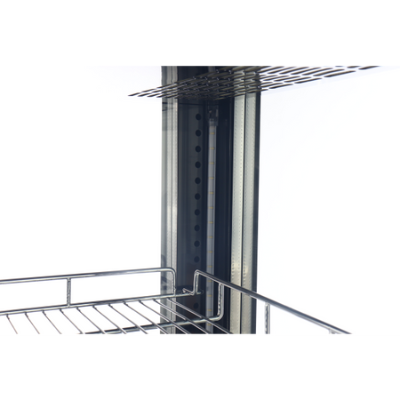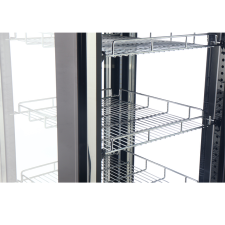 Equipped with three adjustable chrome-coated wire shelves, the freezer provides flexible storage for different products. The bright internal LED lighting enhances visibility, making it perfect for displaying frozen foods in retail environments.