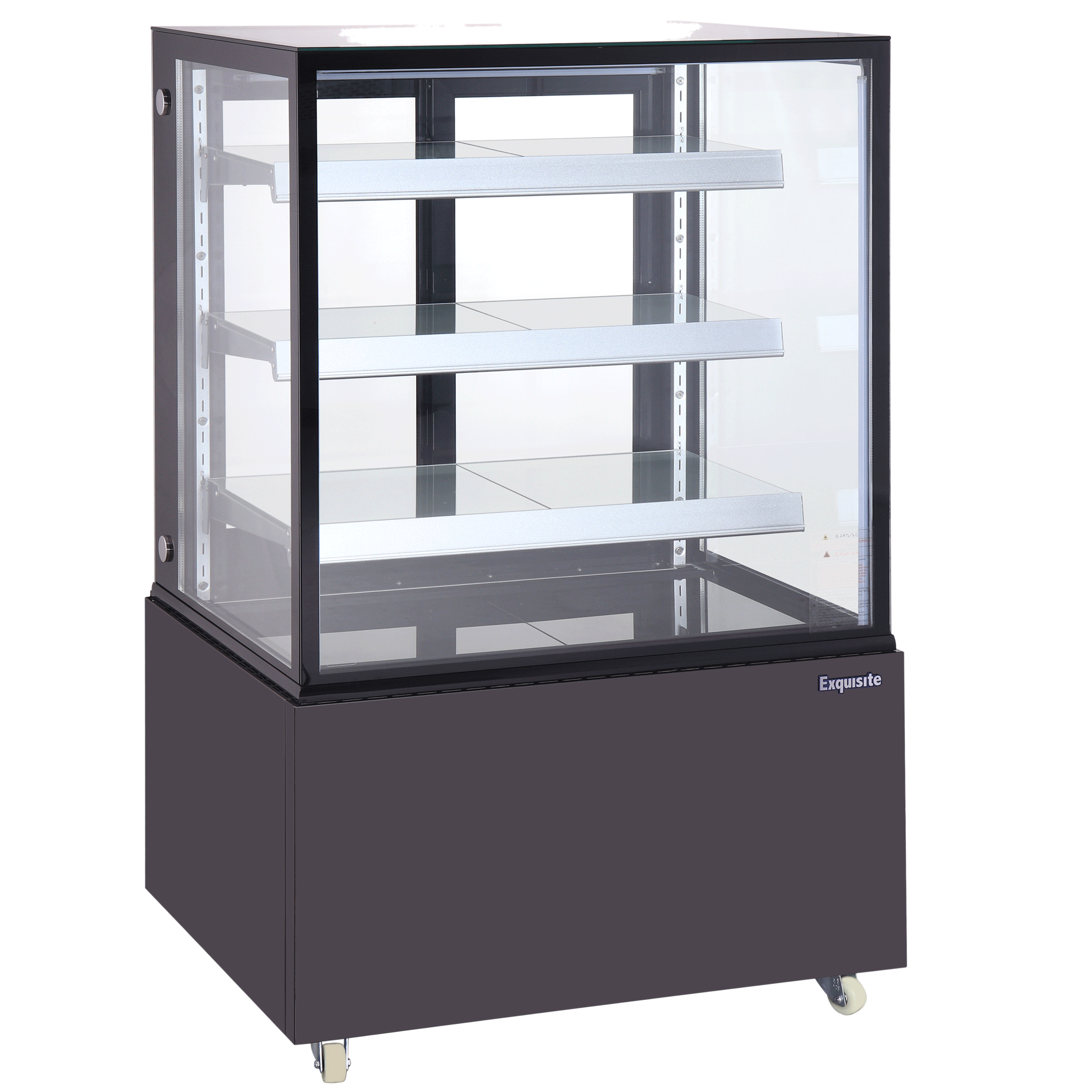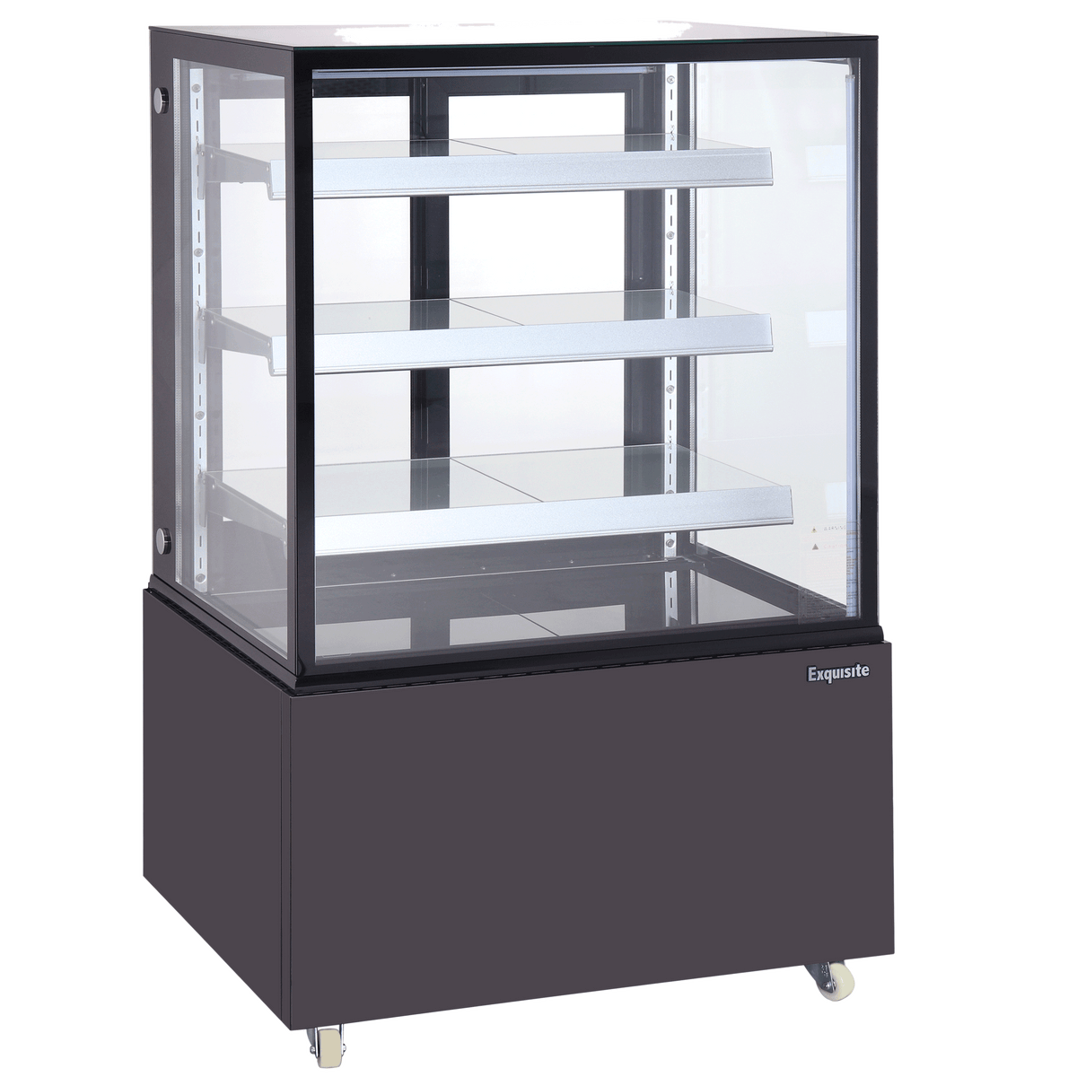 Exquisite CDR309 Four Tiers Cake Display Refrigerators 900mm Width with gross volume 390 Litre. Double glazed glass door for maximum insulation, digital controller and temperature display, dynamic fan forced cooling system with automatic defrosting, black stainless steel finish, frosted glass shelves, sliding door, internal LED light, using R290 gas, temperature set range 2 to 6 Celcius. Warranty: 12 months parts and labour, Australia wide.