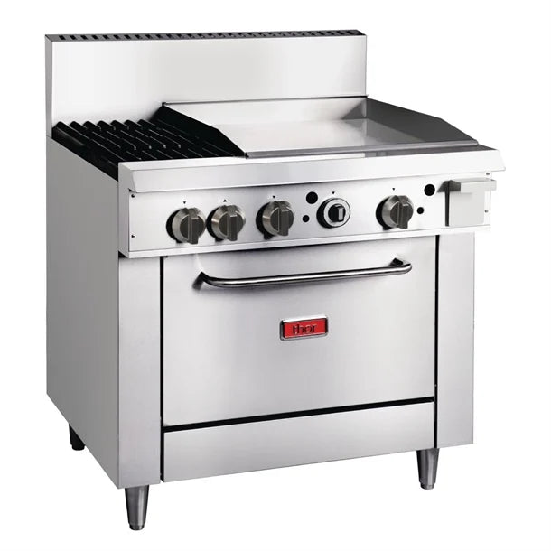From top brand Thor, the 36" natural gas Freestanding Oven range offers exceptional power and reliability for the busiest of food outlets. With the added versatility of a heavy duty 24" griddle and two open burners, the oven range is perfect for cooking multiple foods at once. The robust stainless steel exterior is both hard wearing and easy to clean, whilst the durable dial controls are precise and easy to use. Please note: when installed the unit requires a total of 156.5MJ/h to correctly operate.