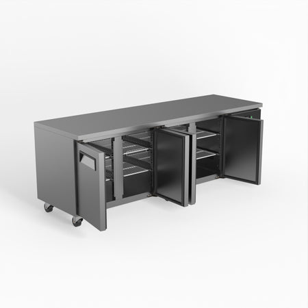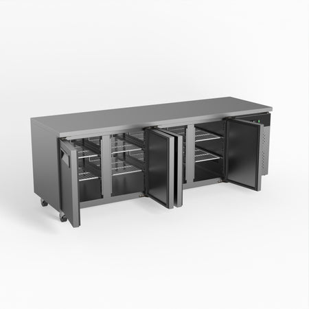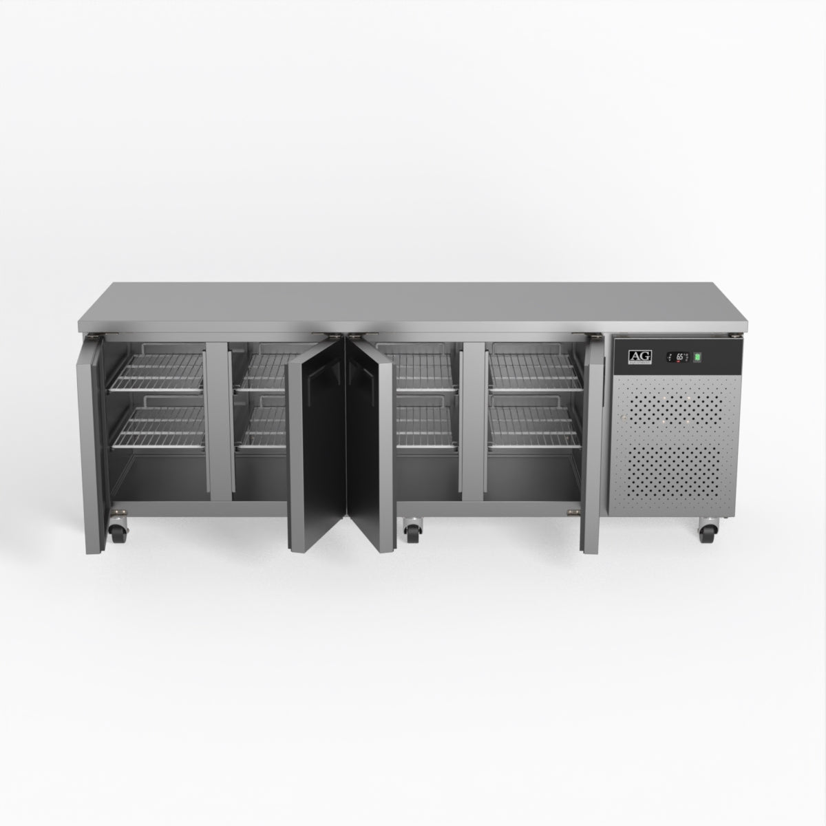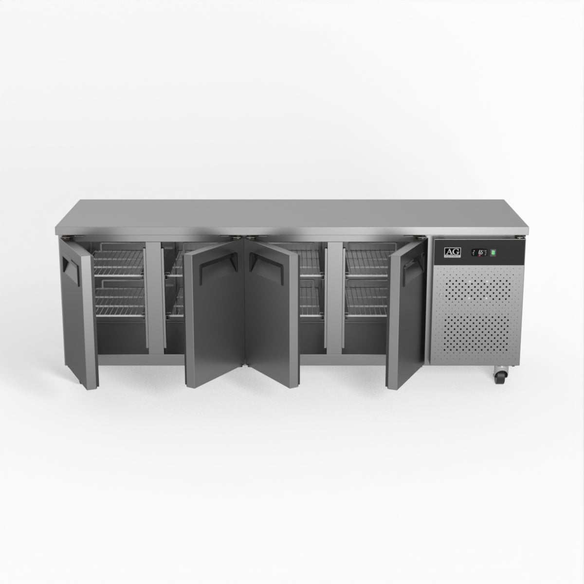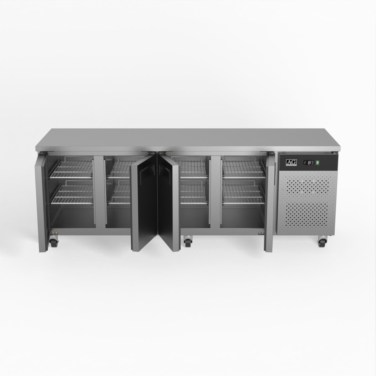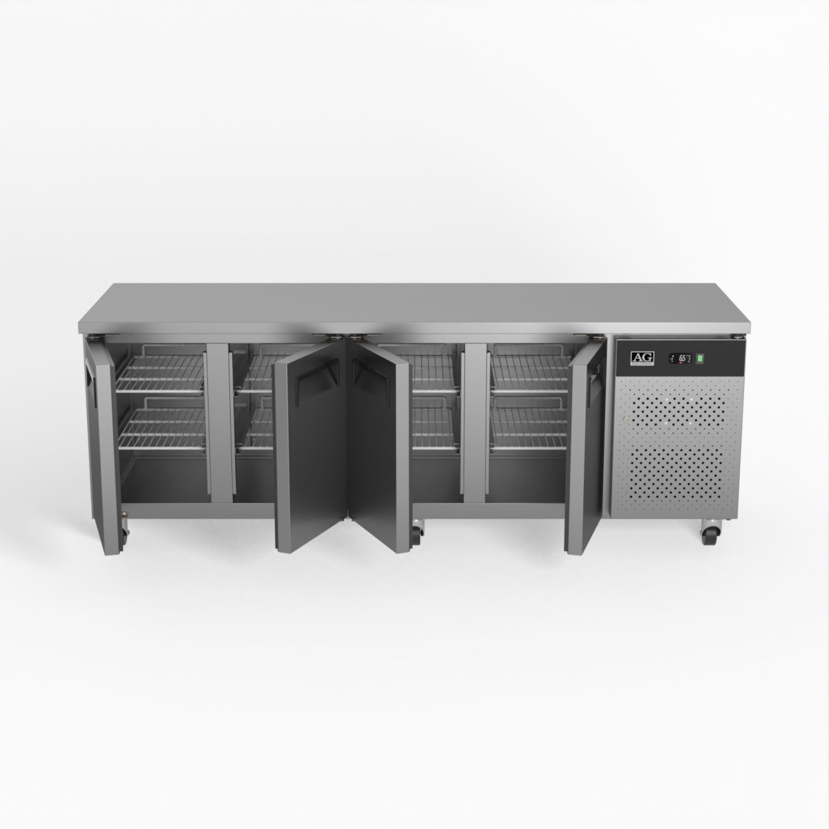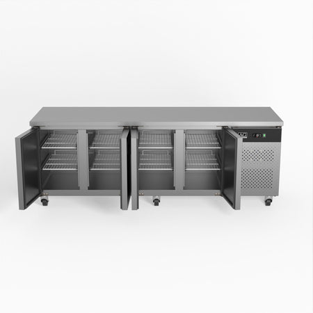 Our 4-door commercial worktop refrigerator comes standard with castor wheels for easy manoeuvrability. It is fitted with self-closing doors so you can let them just swing shut, saving you time and improving efficiency. This smart bench / under-bench fridge is designed for busy kitchens in pubs, restaurants, and bars. 4 doors, each with two adjustable wire shelves, allow this fridge to utilise its full 553-litre capacity. This model can store a multitude of items, with internal LED lighting providing easy visibility. The robust stainless-steel body is capable of withstanding an ambient temperature of up to 43°C. It is also fitted with fan-forced, ventilated cooling and electronic temperature controls.