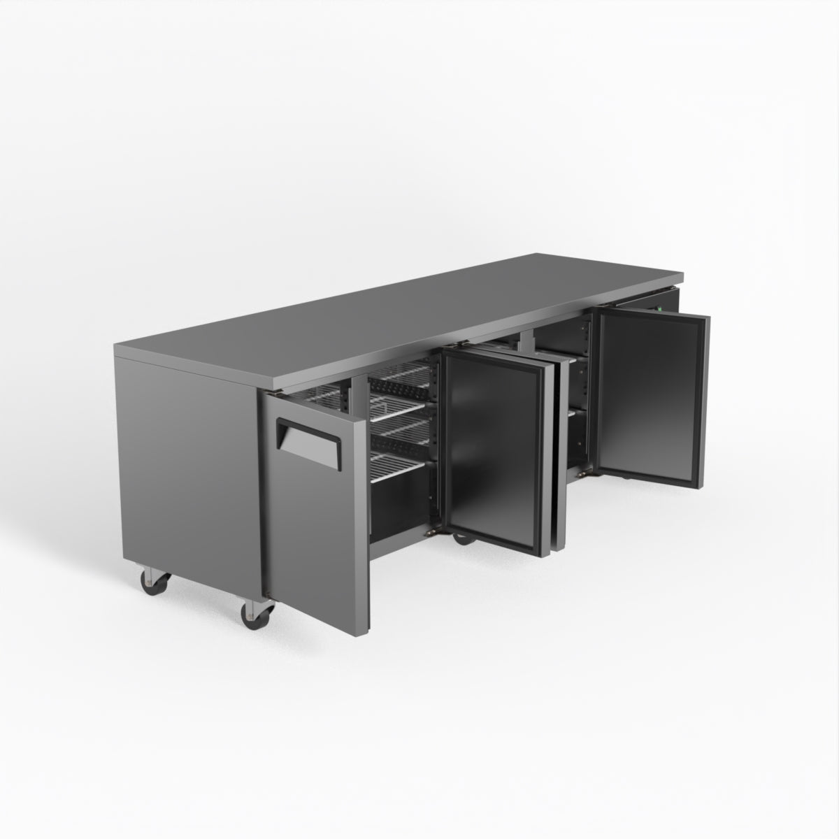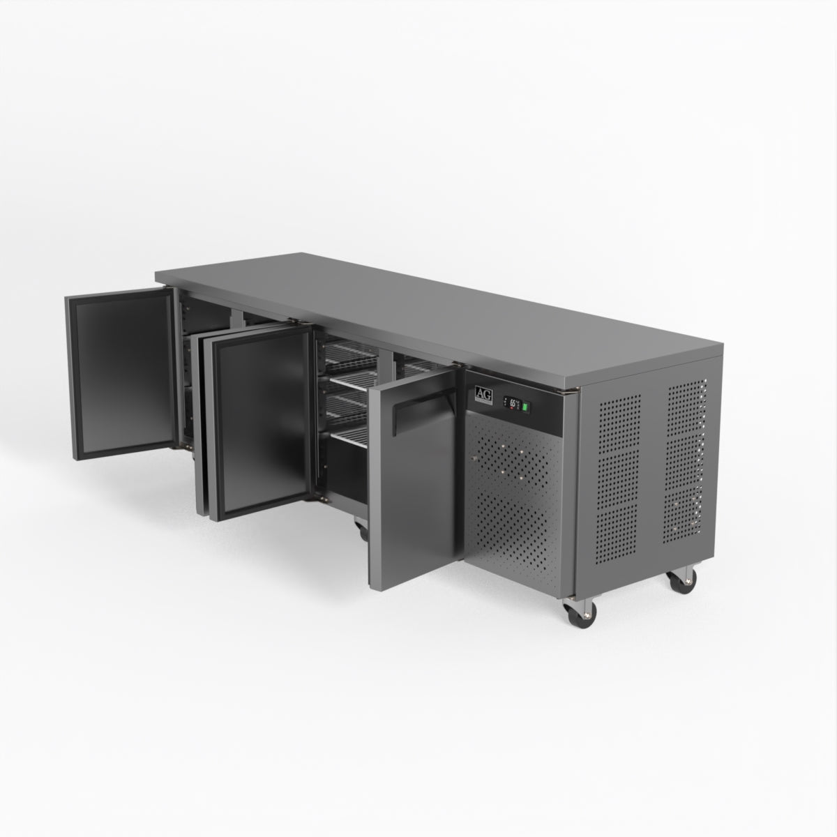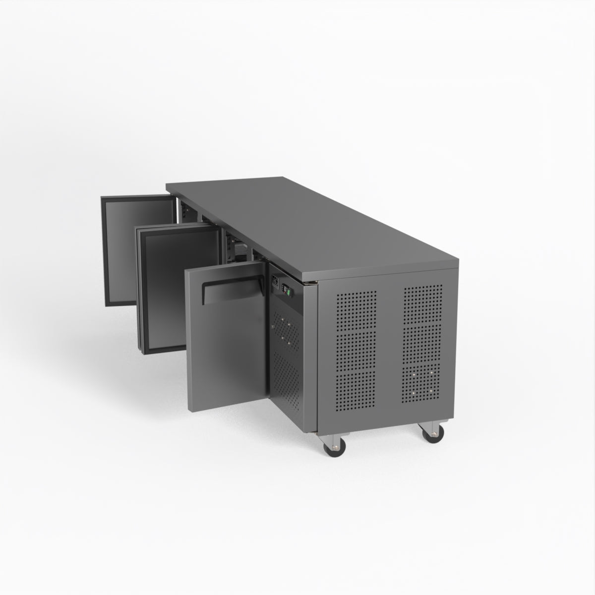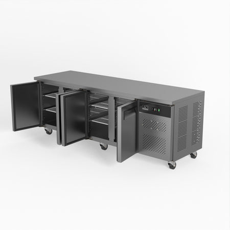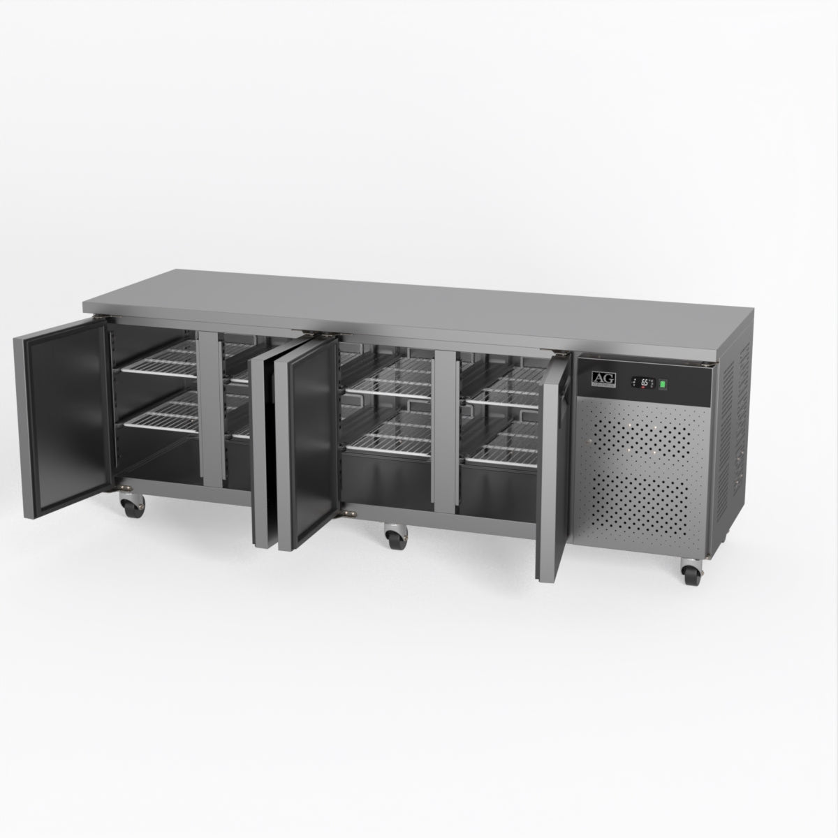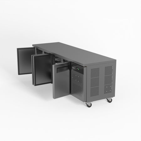 Our 4-door commercial worktop refrigerator comes standard with castor wheels for easy manoeuvrability. It is fitted with self-closing doors so you can let them just swing shut, saving you time and improving efficiency. This smart bench / under-bench fridge is designed for busy kitchens in pubs, restaurants, and bars. 4 doors, each with two adjustable wire shelves, allow this fridge to utilise its full 553-litre capacity. This model can store a multitude of items, with internal LED lighting providing easy visibility. The robust stainless-steel body is capable of withstanding an ambient temperature of up to 43°C. It is also fitted with fan-forced, ventilated cooling and electronic temperature controls.