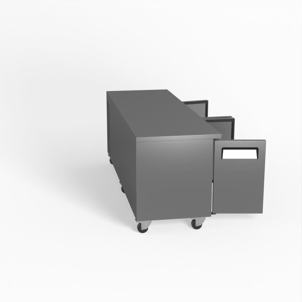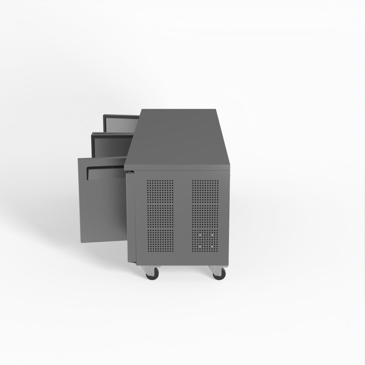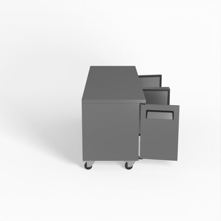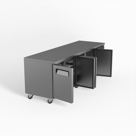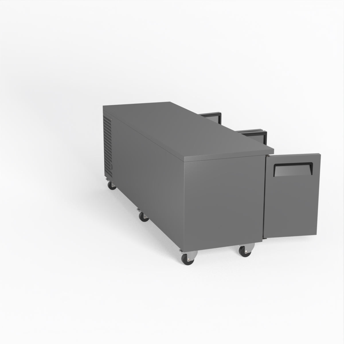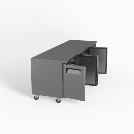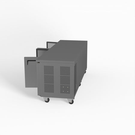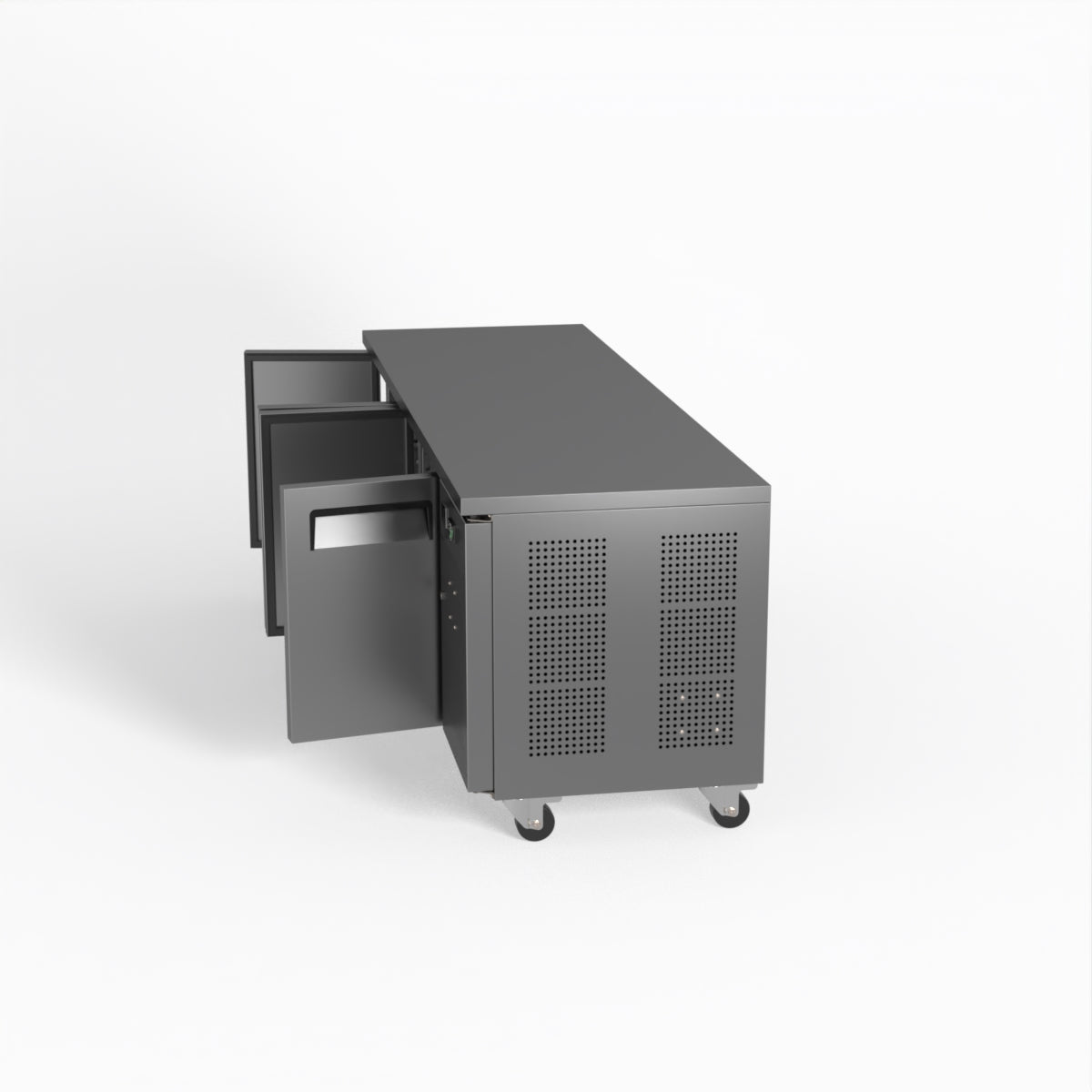 Our 4-door commercial worktop refrigerator comes standard with castor wheels for easy manoeuvrability. It is fitted with self-closing doors so you can let them just swing shut, saving you time and improving efficiency. This smart bench / under-bench fridge is designed for busy kitchens in pubs, restaurants, and bars. 4 doors, each with two adjustable wire shelves, allow this fridge to utilise its full 553-litre capacity. This model can store a multitude of items, with internal LED lighting providing easy visibility. The robust stainless-steel body is capable of withstanding an ambient temperature of up to 43°C. It is also fitted with fan-forced, ventilated cooling and electronic temperature controls.