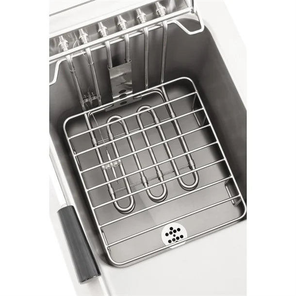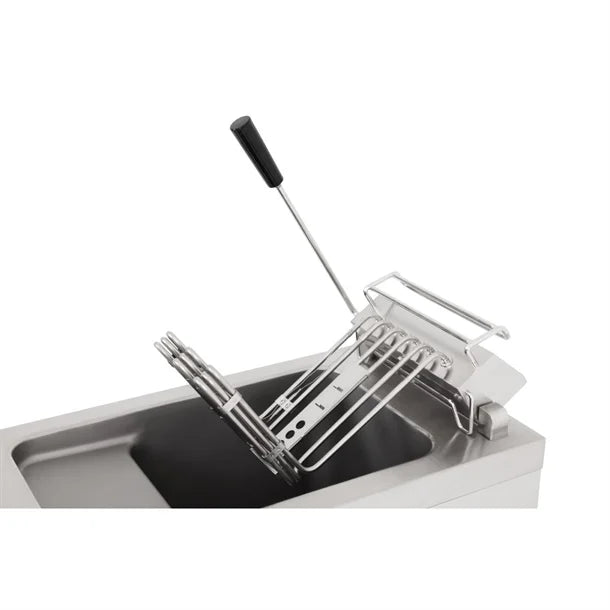 Built with durable stainless steel construction, the fryer is designed for long-term reliability in commercial kitchens. Cleaning is simple thanks to the hinged heating elements, which provide full access to the tank, and the oil drain tap for easy oil removal.