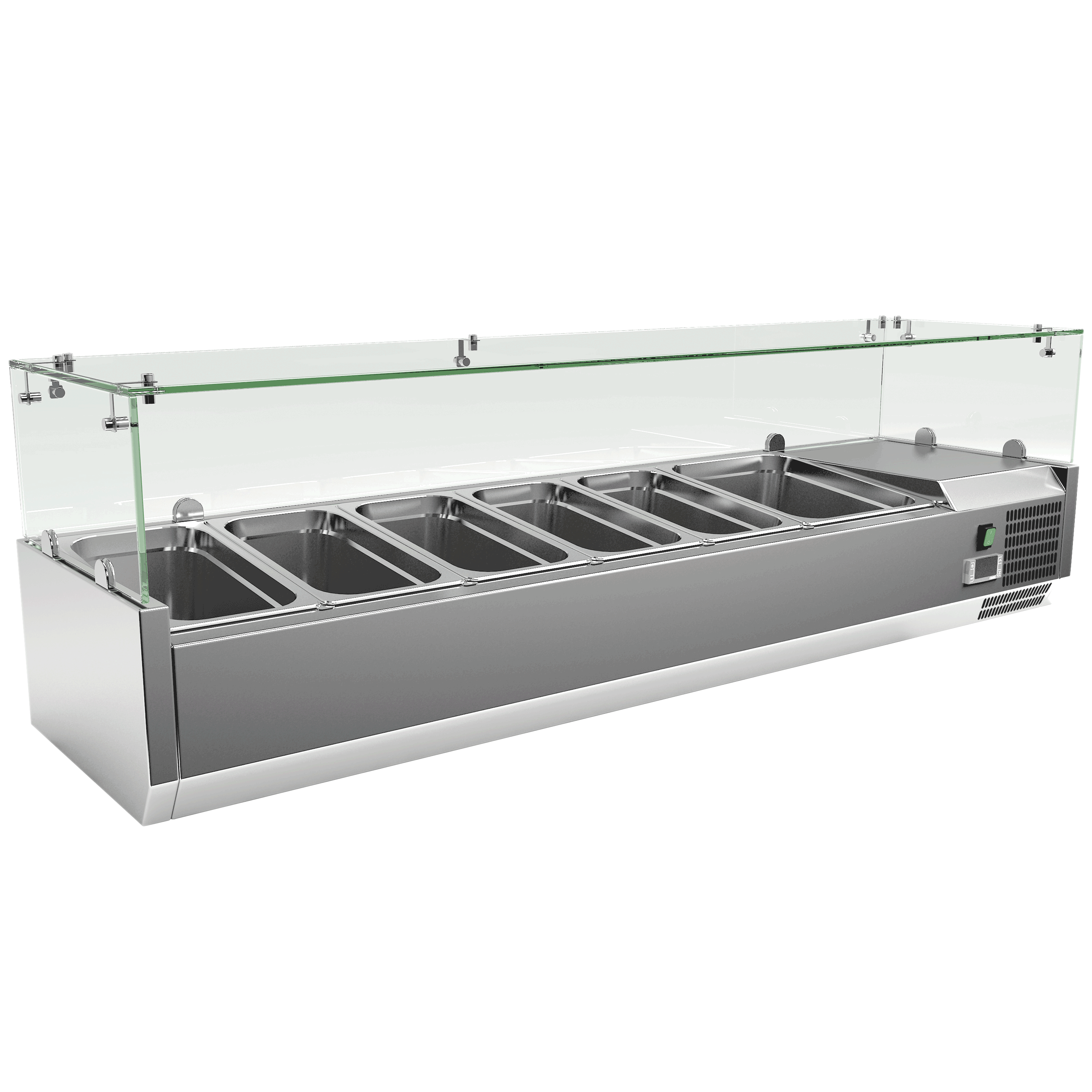 Exquisite ICT1500 Counter Top Food Preparation Refrigerators 1500mm Width - 5 x GN1/3 + 1 x GN1/2 (Excluding Pans). Equiped with digital controller and temperature display, dynamic fan forced cooling system with automatic defrosting, stainless steel and glass top cabinet finish, to fit 150mm high GN pans and using R600 gas, temperature set range 2 to 10 Celcius. Warranty: 15 months parts and labour, Australia wide.