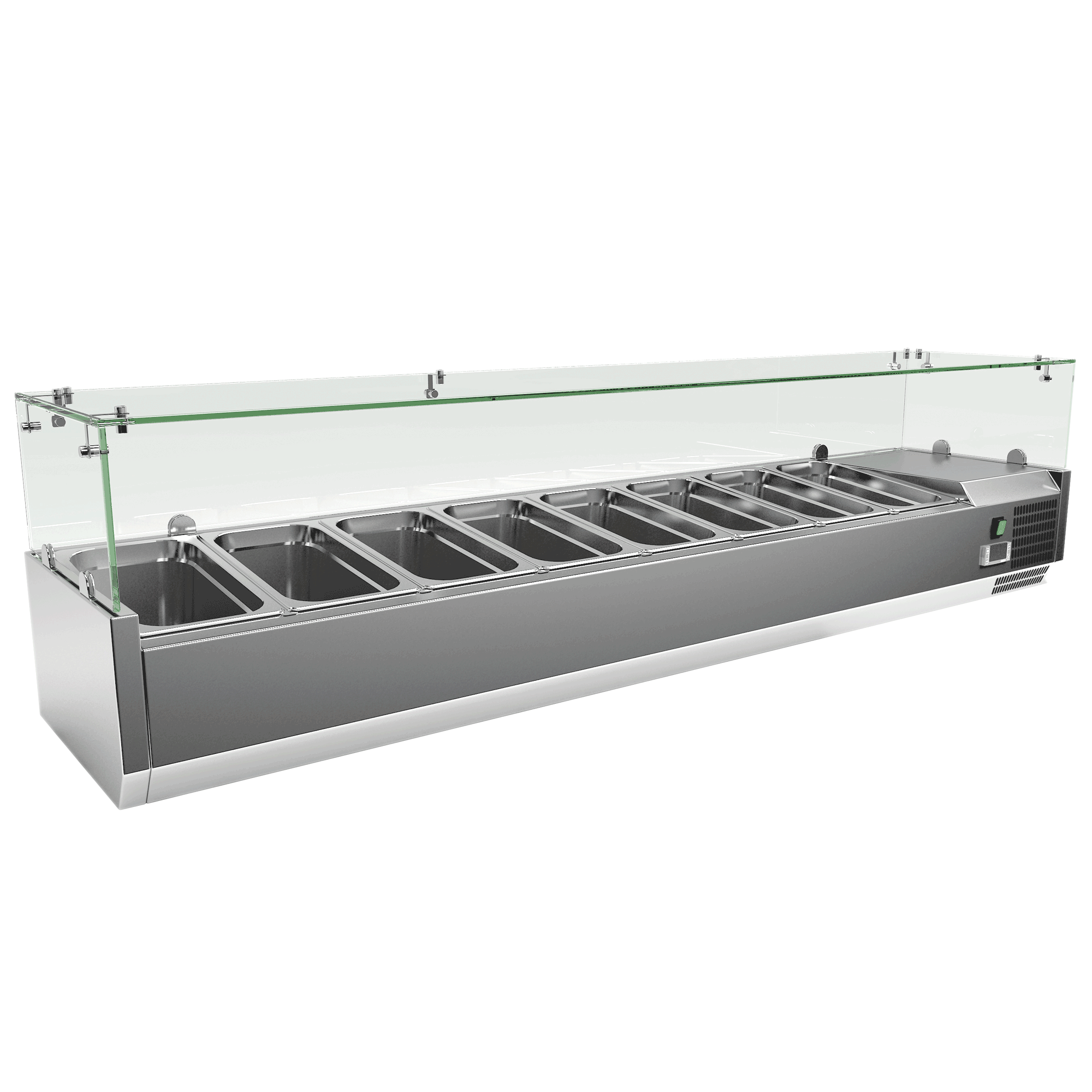 Exquisite ICT1800 Counter Top Food Preparation Refrigerators 1800mm Width - 8 x GN1/3 (Excluding Pans). Equiped with digital controller and temperature display, dynamic fan forced cooling system with automatic defrosting, stainless steel and glass top cabinet finish, to fit 150mm high GN pans and using R600 gas, temperature set range 2 to 10 Celcius. Warranty: 15 months parts and labour, Australia wide.