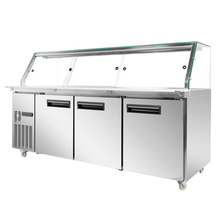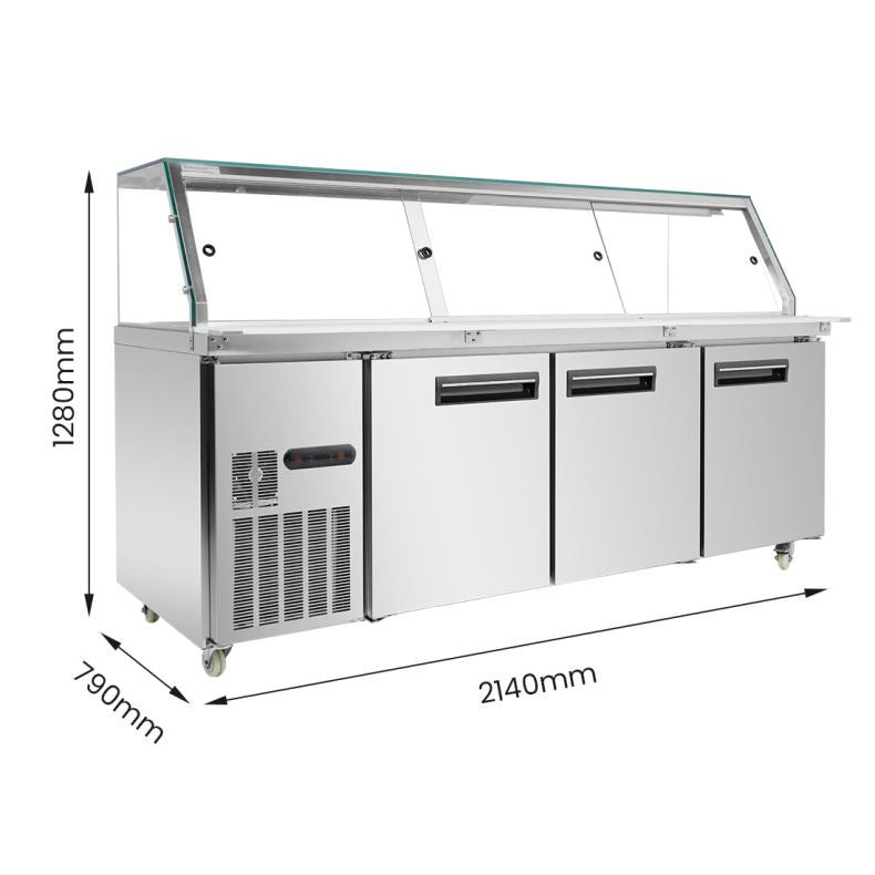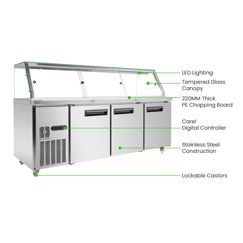 - ✅ Additional Features – Includes a 220mm deep PE chopping board, automatic condensation evaporation, castors for mobility, and tempered glass canopy for added durability and convenience.