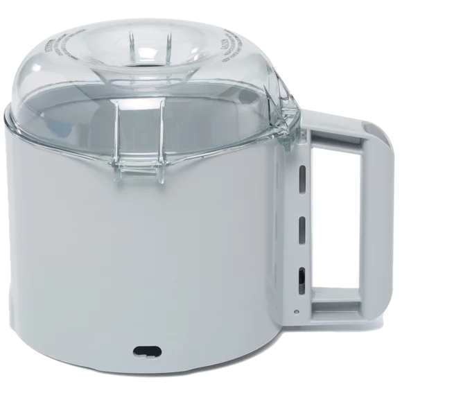 R 211 XL Food Processor: Cutter/Vegetable Slicer. Single phase. Power 550W. Speed: 1500 rpm. 2.9 litre cutter bowl in composite material and smooth bowl-base blade assembly. Vegetable preparation attachment in composite material with side ejection equipped with 2 hoppers : 1 large and 1 cylindrical hopper. Supplied with 4 stainless steel discs: 2 and 4 mm slicers, 2 mm graters and 4x4 mm julienne. Large range of 23 stainless steel discs available as option. 10 to 30 meals. Cutter attachment: lid, bowl, and high resistance stainless steel smooth blade assembly with removable cap.
