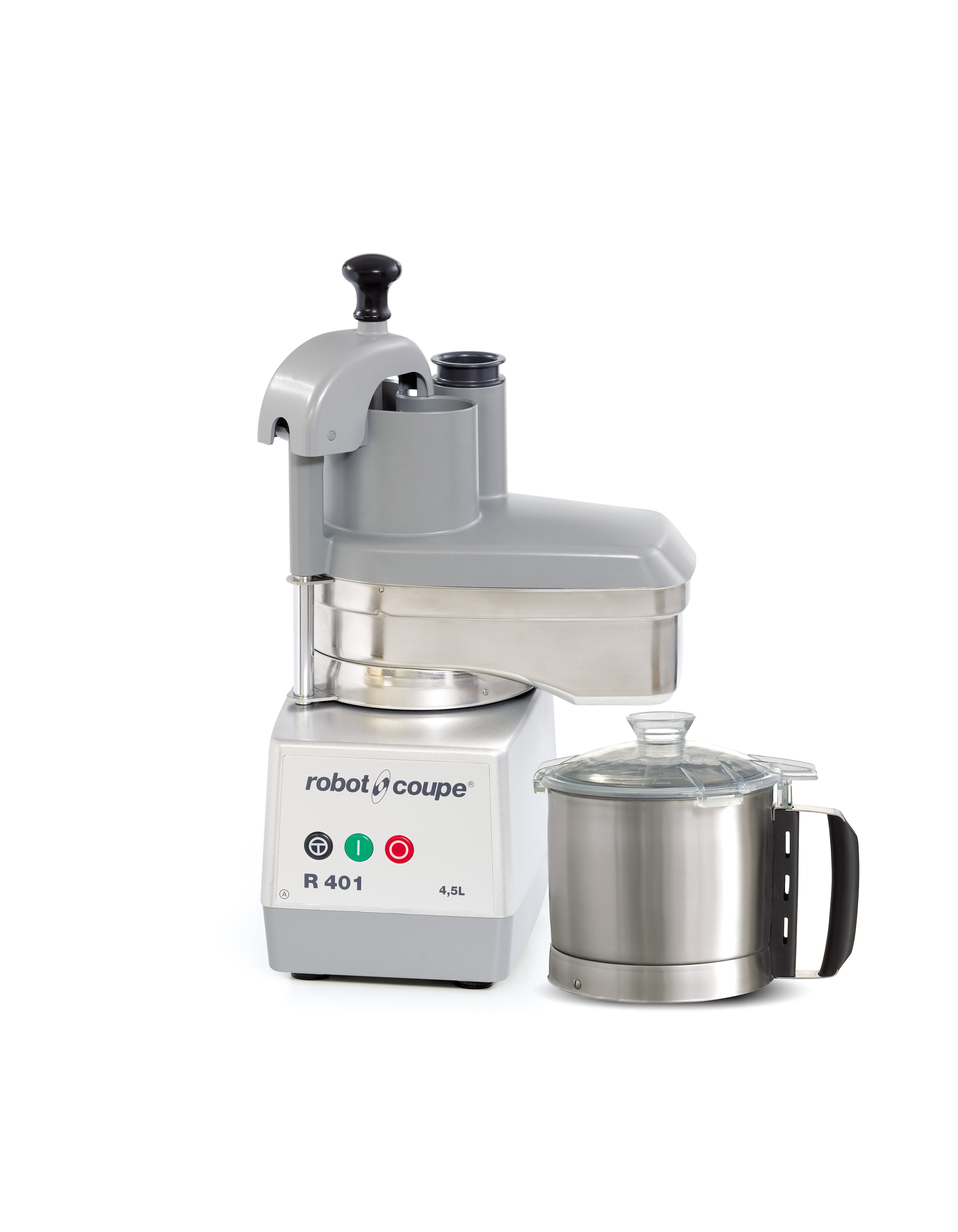 R 401 Food Processor: Cutter/Vegetable Slicer equipped with a cutter attachment for chopping, fine mincing, emulsions, grinding and kneading, and a Vegetable preparation attachment for slicing, grating, ripple cut slicing, and julienne.