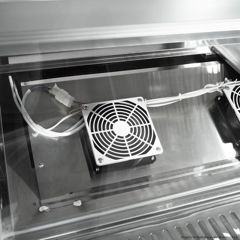 Featuring three adjustable wired shelves plus the base, LED lighting at every level, and a triple-glazed front with heated wire filaments, products remain clearly visible and free from condensation even in very high-humidity conditions. The stainless steel frame provides durability, easy cleaning, and a premium commercial finish.