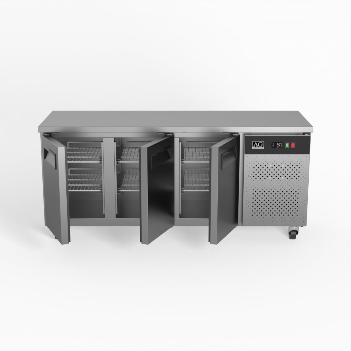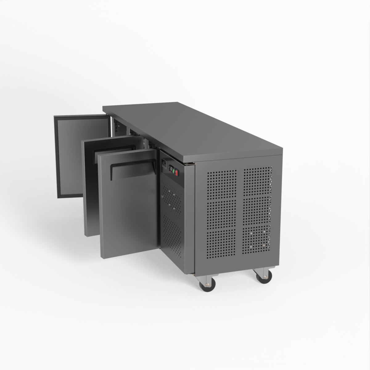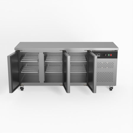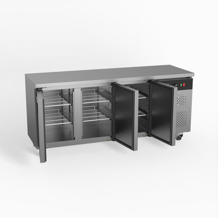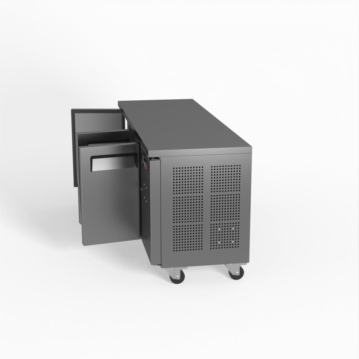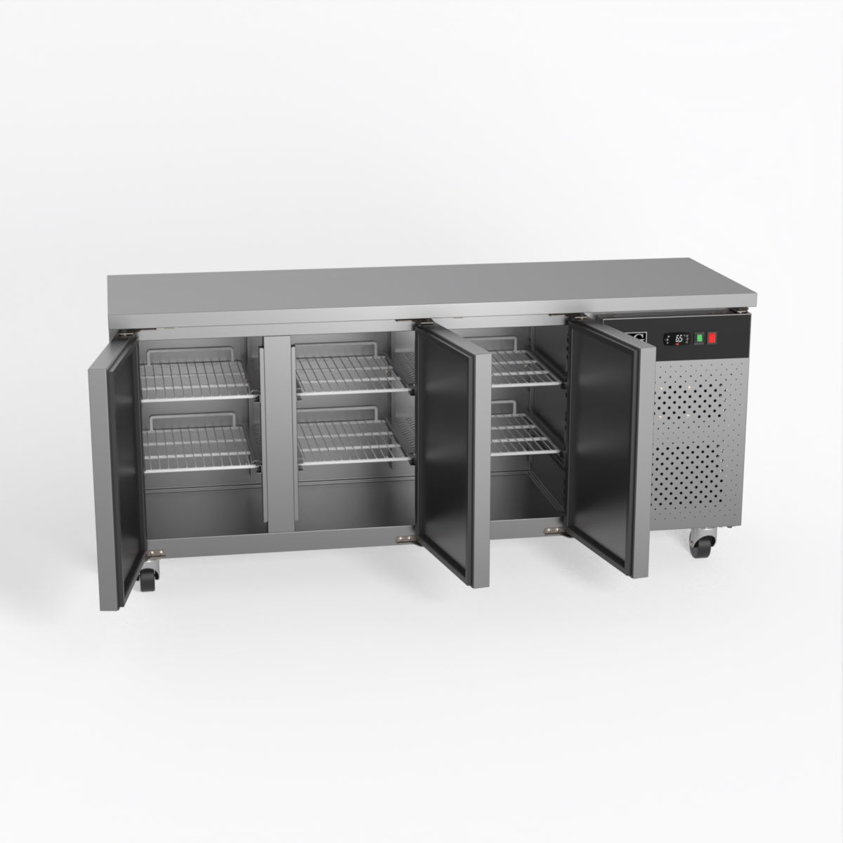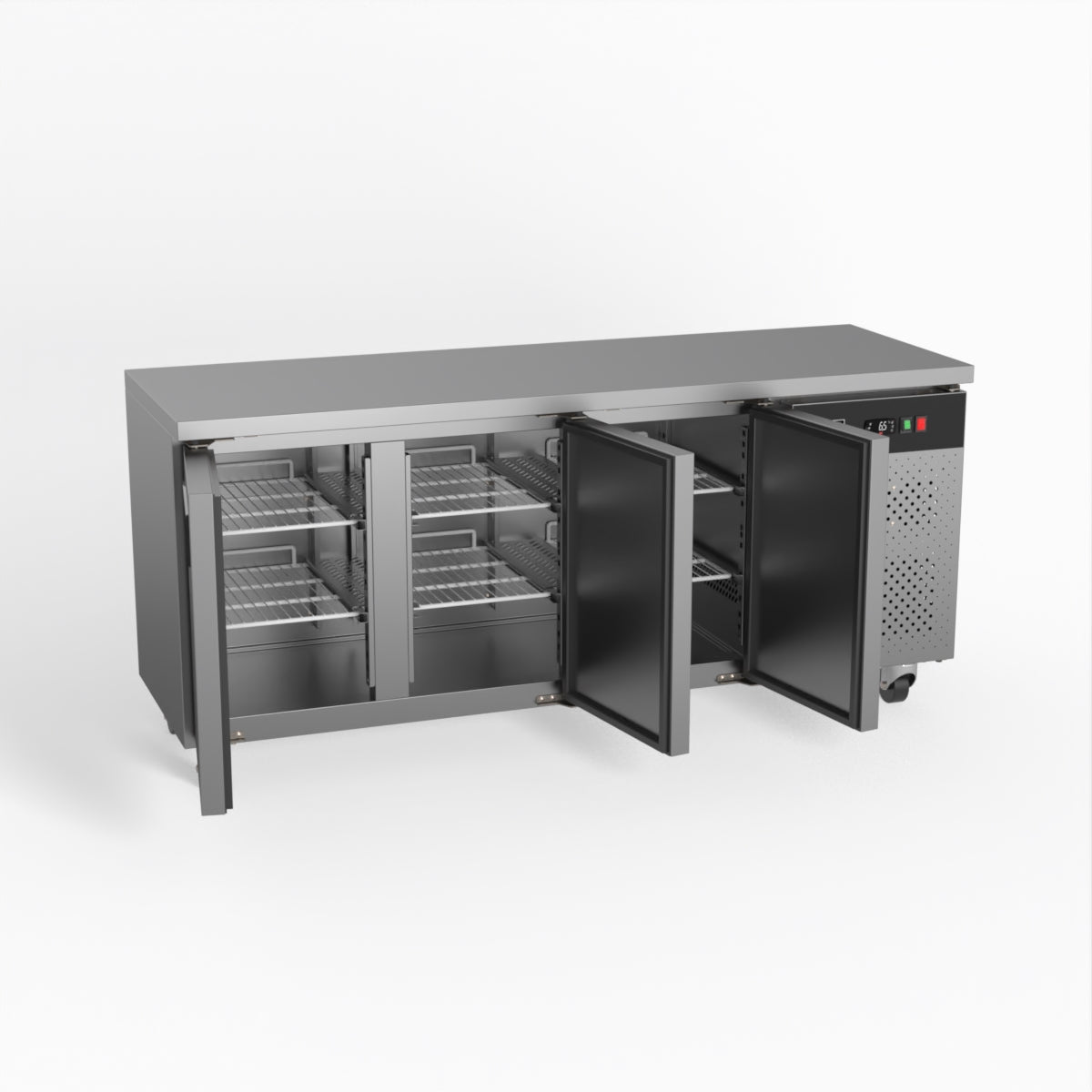 The heavy-duty stainless-steel worktop freezer conserves both space and energy and can be used as an under-bench or worktop. Fitted with heavy-duty doors, a Carel digital temperature controller, and a Cubigel compressor, this commercial unit is designed to function in environments of up to 43°C/65% humidity. Designed for restaurants, bars, clubs, and other hospitality venues, it features a unique centre-shelf connector so loose items do not fall through.