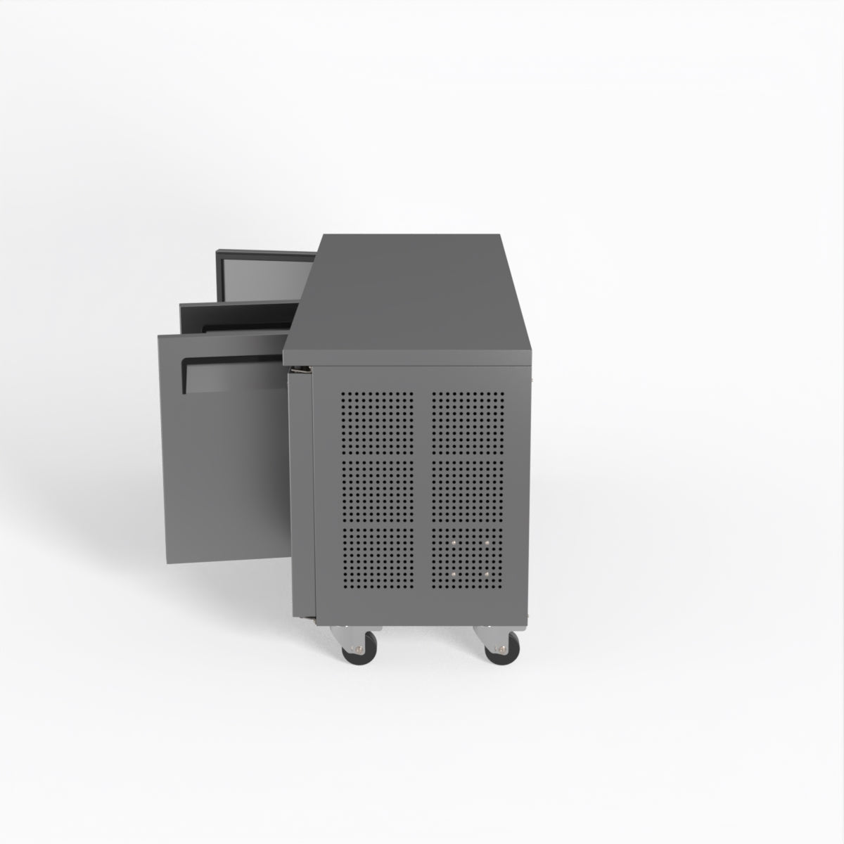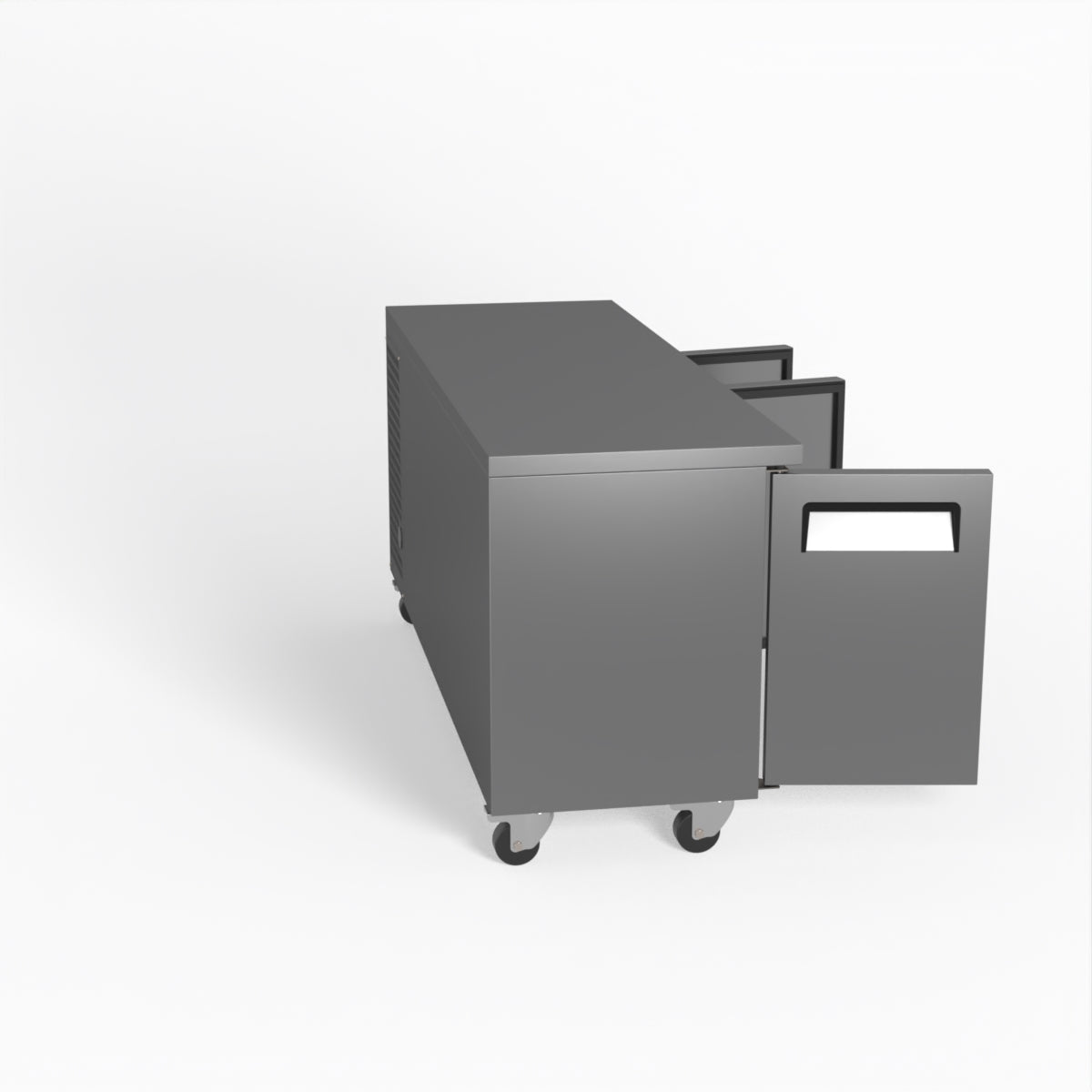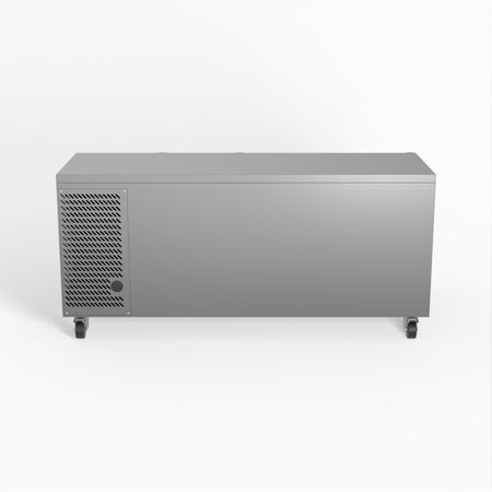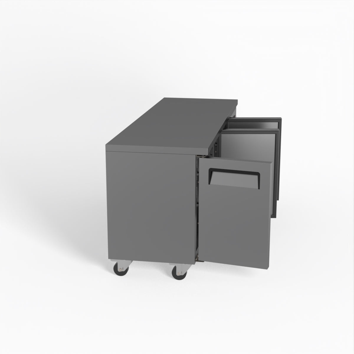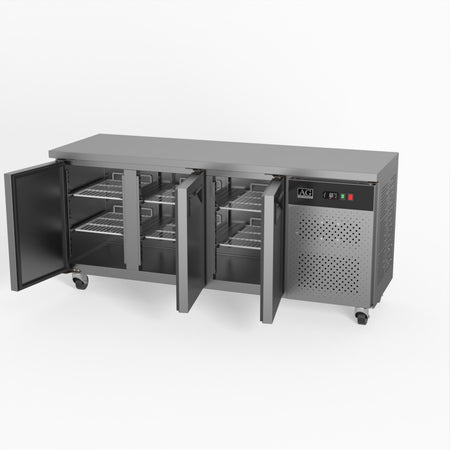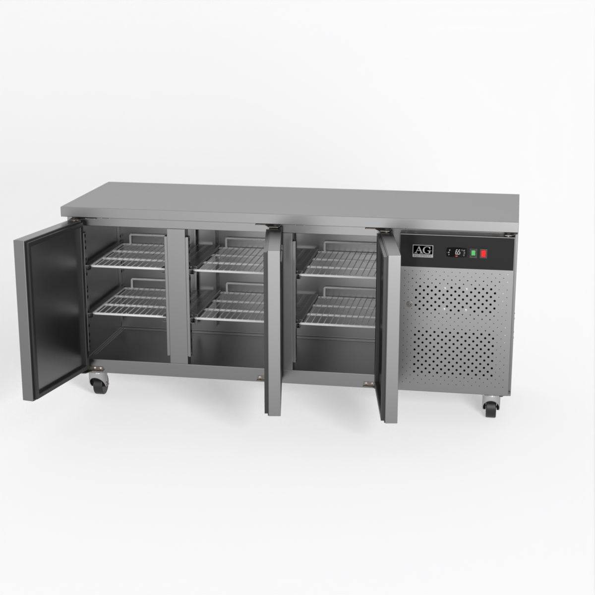 The heavy-duty stainless-steel worktop freezer conserves both space and energy and can be used as an under-bench or worktop. Fitted with heavy-duty doors, a Carel digital temperature controller, and a Cubigel compressor, this commercial unit is designed to function in environments of up to 43°C/65% humidity. Designed for restaurants, bars, clubs, and other hospitality venues, it features a unique centre-shelf connector so loose items do not fall through.