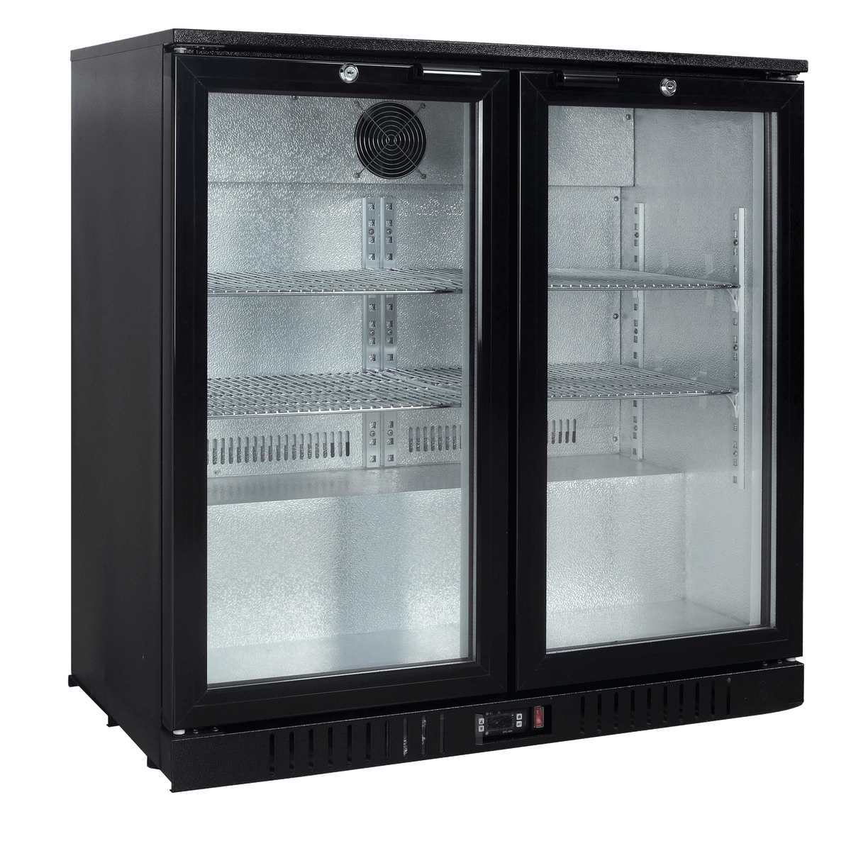 Exquisite UBC210 Two Swing Doors Backbar Display Refrigerators 900mm Height with gross volume 219 Litre. Lockable double glazed glass doors, digital controller and temperature display, dynamic fan forced cooling system with automatic defrosting, black steel external finish and aluminium steel internal finish, chrome coated steel shelves, internal LED light, using R600a gas, temperature set range 0 to +10 Celcius. Warranty: 12 months parts and labour, Australia wide.