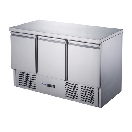 This 368 L three-door workbench fridge offers static cooling with Dixell digital temperature control, ensuring stable performance and precise operation. Compact and versatile, it doubles as a prep surface or under-counter fridge to maximise workspace efficiency in busy commercial kitchens.