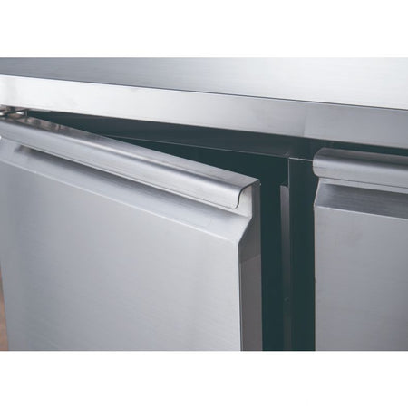 This two-door stainless steel saladette fridge offers fan-forced cooling for even temperature control and rapid recovery. Designed for heavy-duty use and tropical Australian conditions, it features premium components, digital temperature control and smooth mobility on castors.